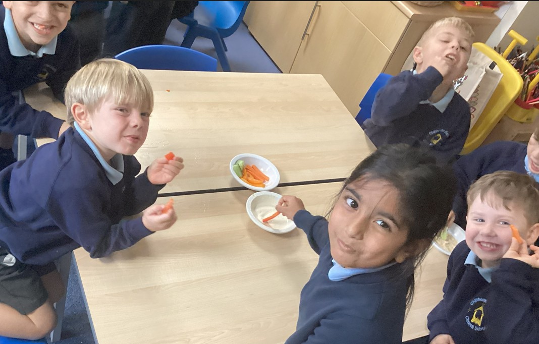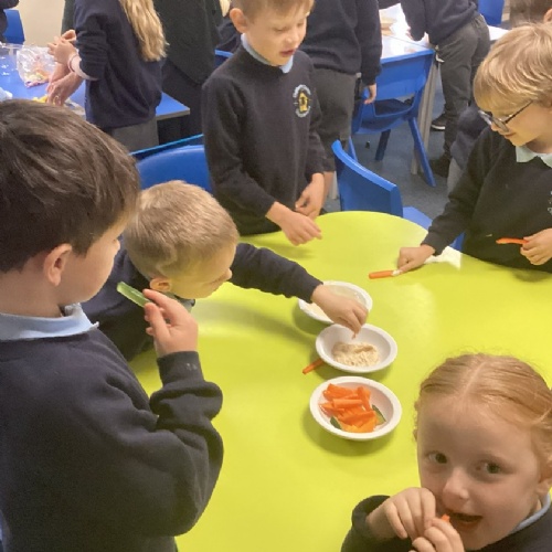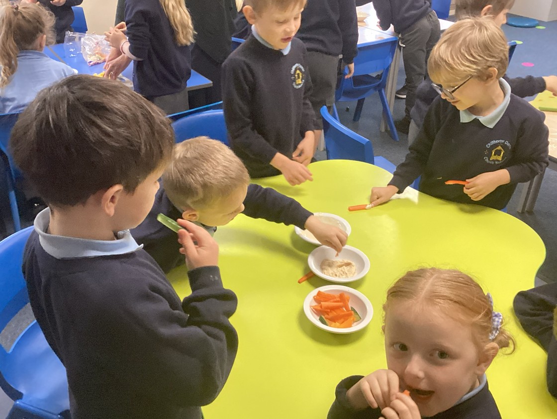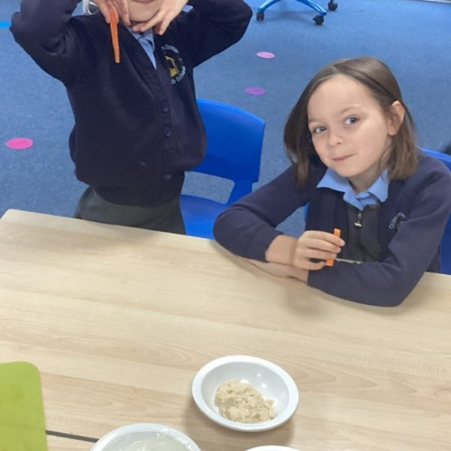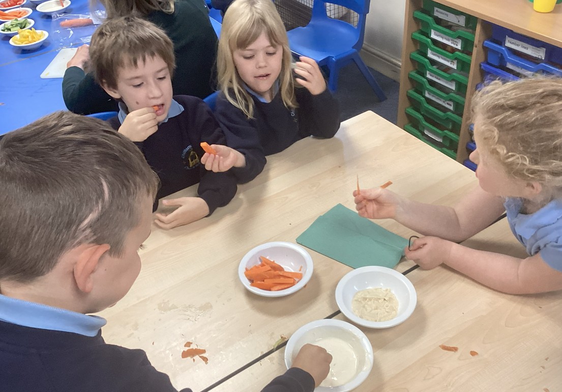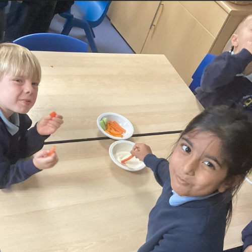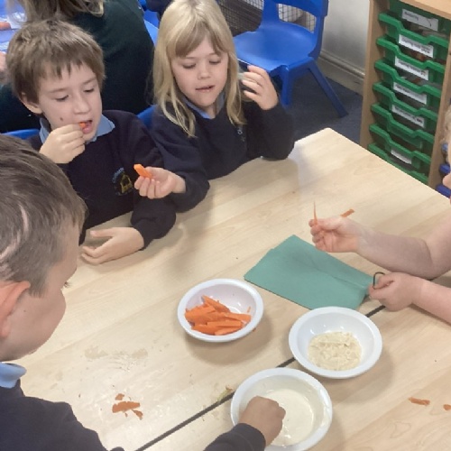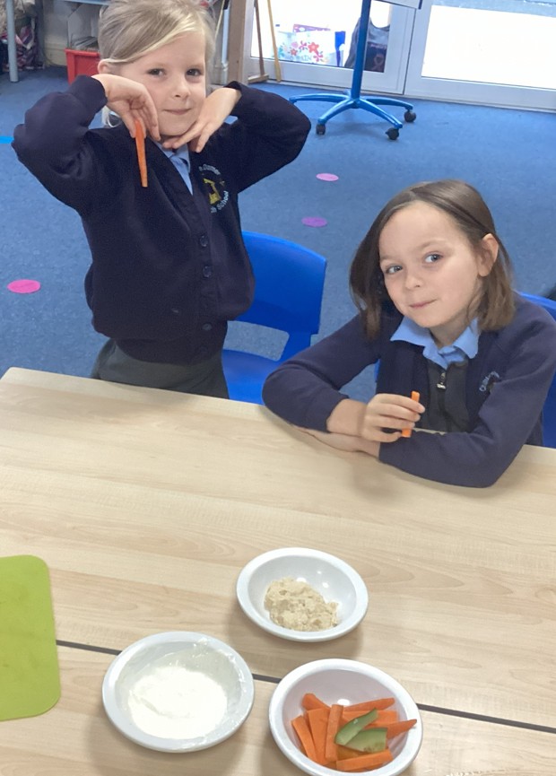 As part of learning about healthy eating, we made humus and a yoghurt dip.  We then chopped vegetables to dip into them. Yum! We were all excellent at trying new things!