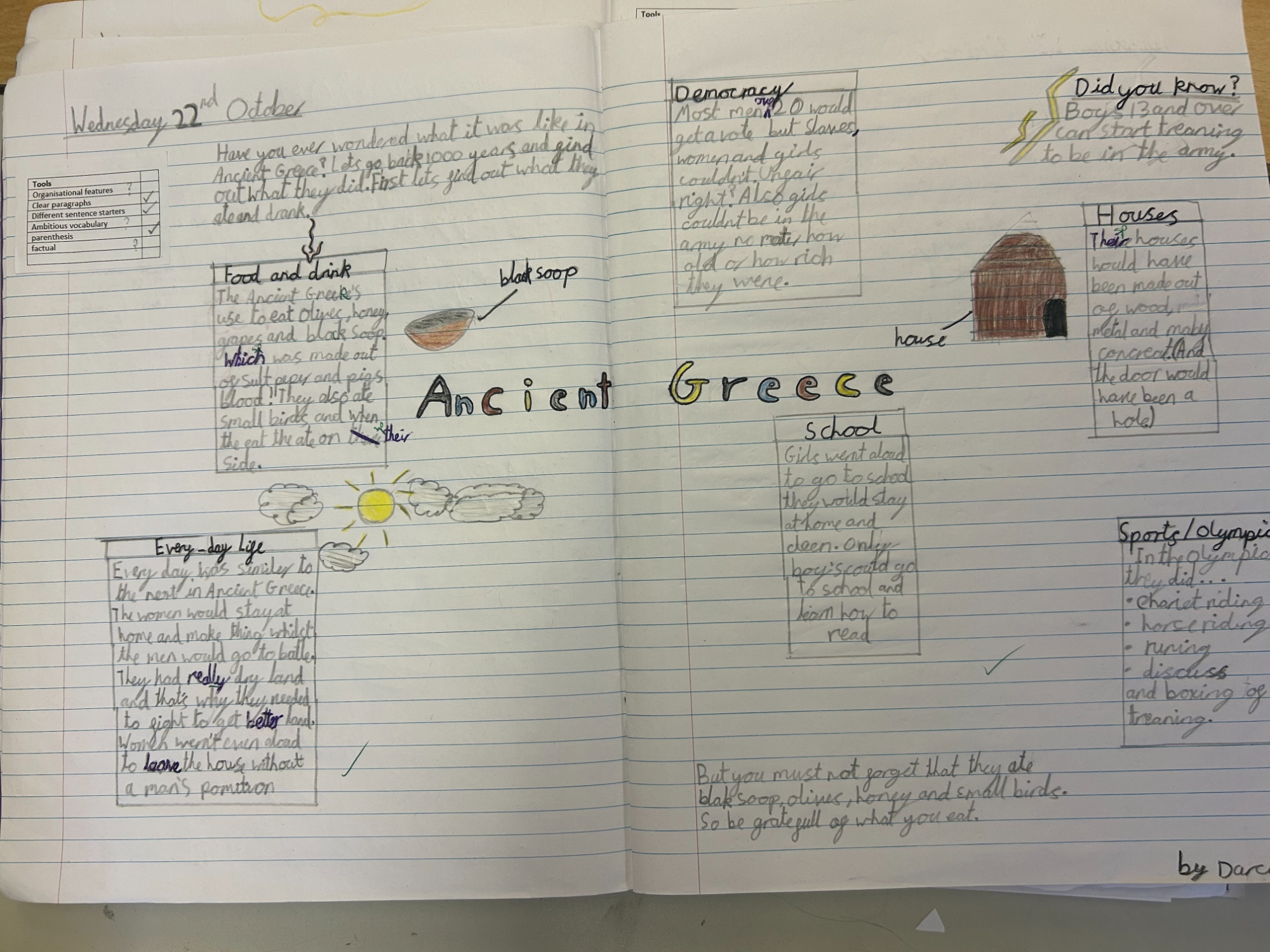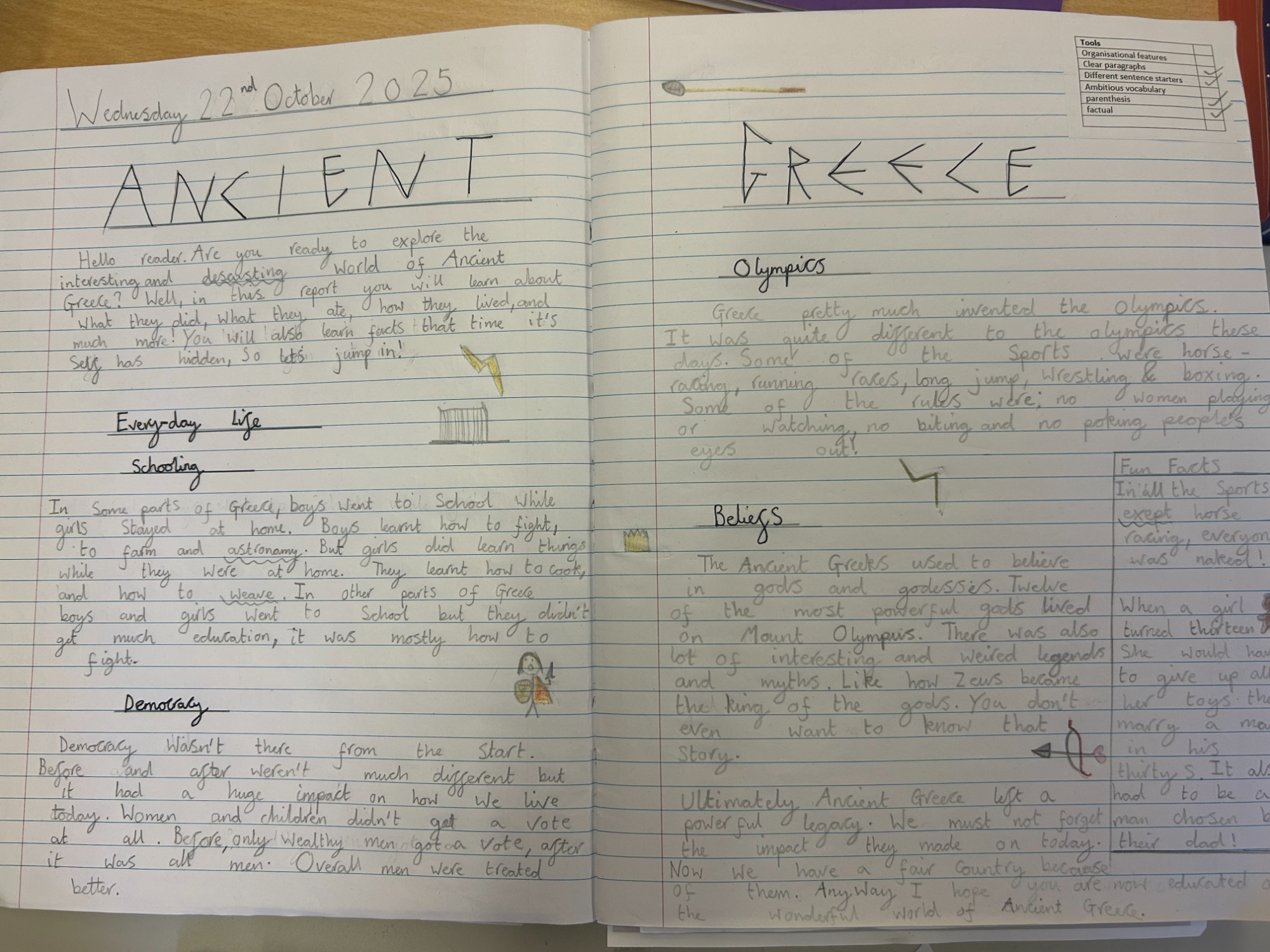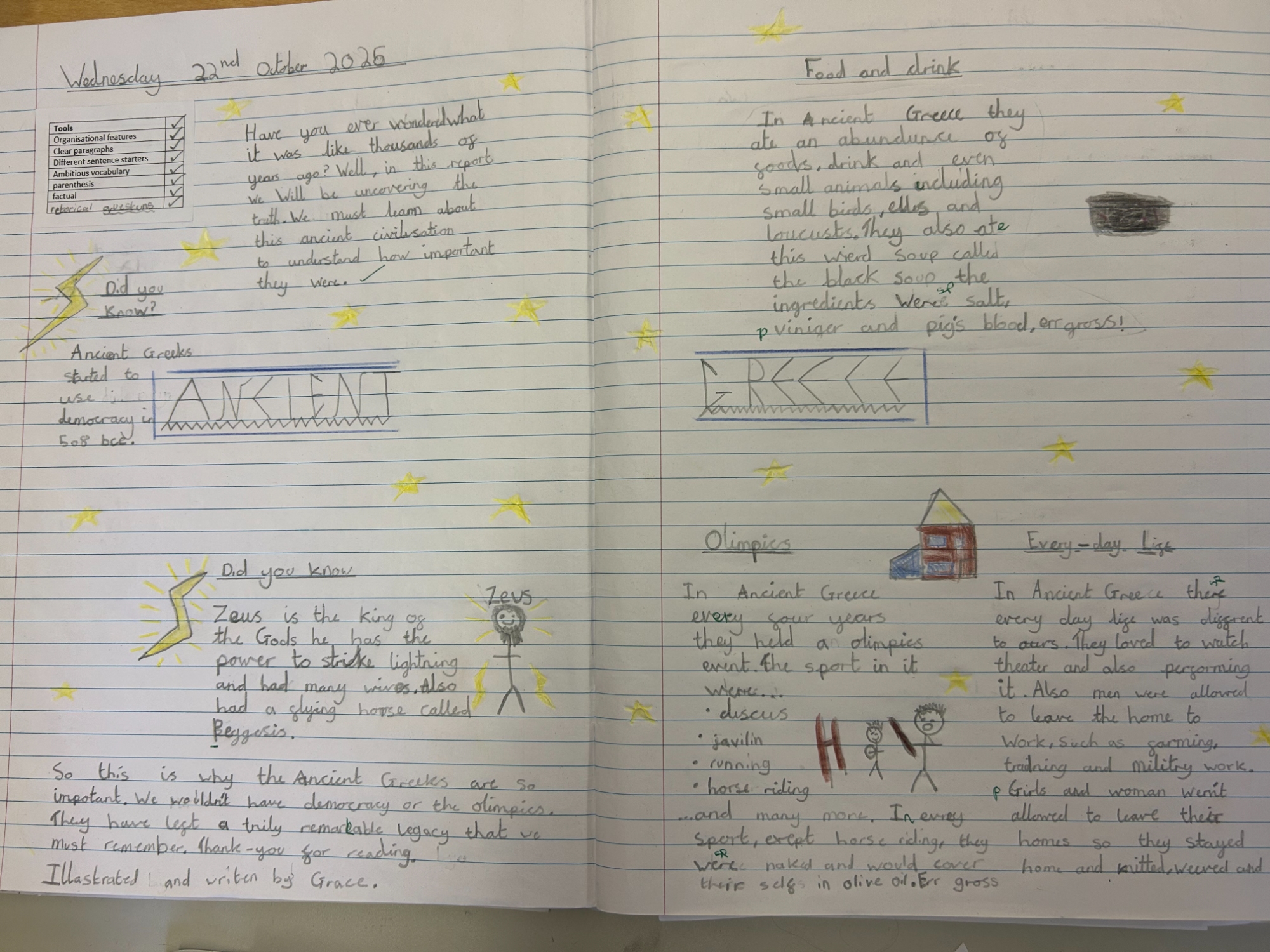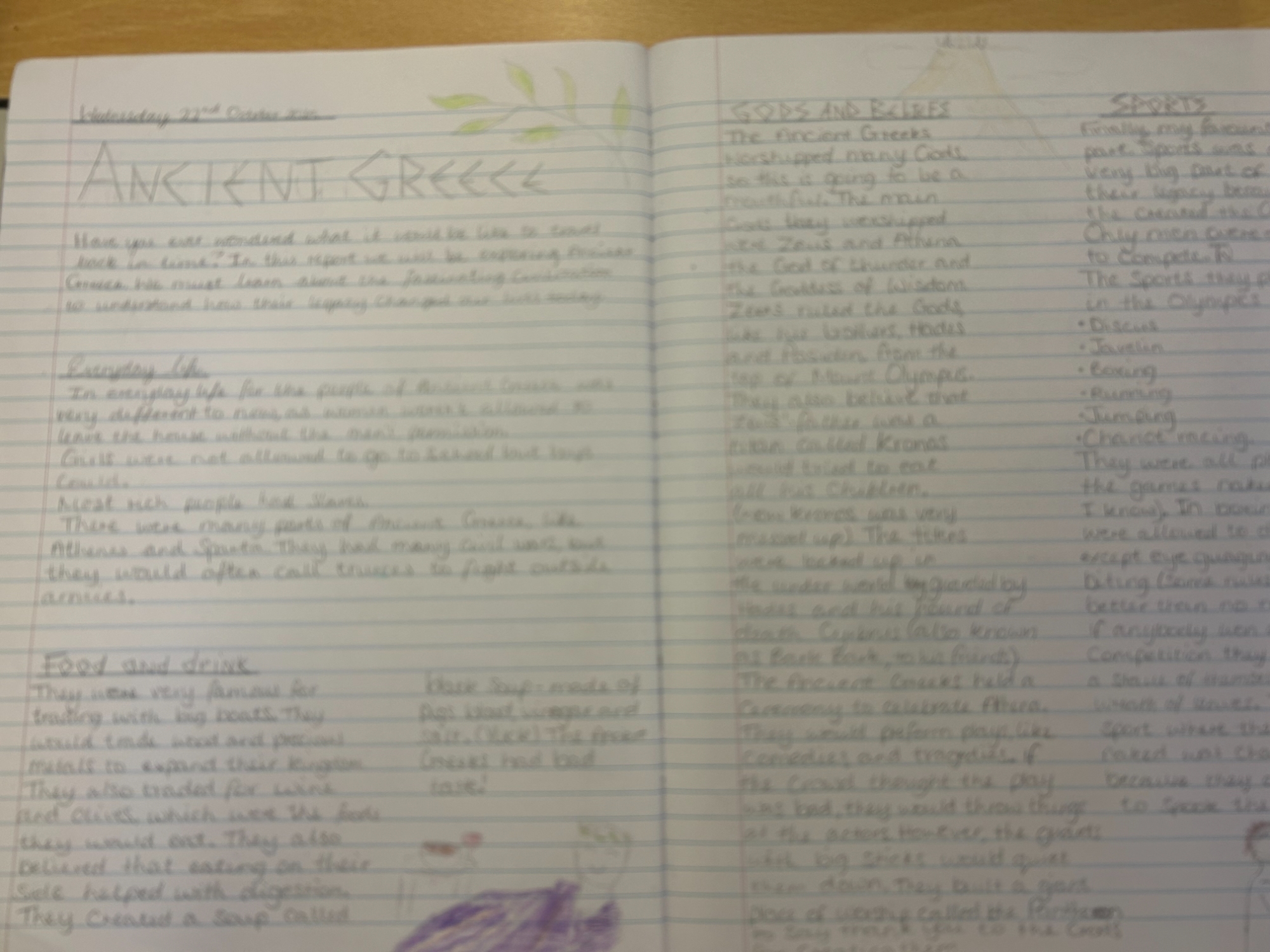 After completing our unit on Ancient Greece, the children were challenged to write reports using everything they know!