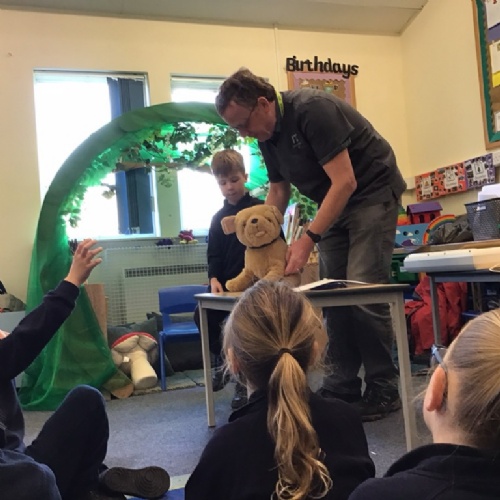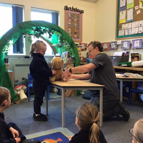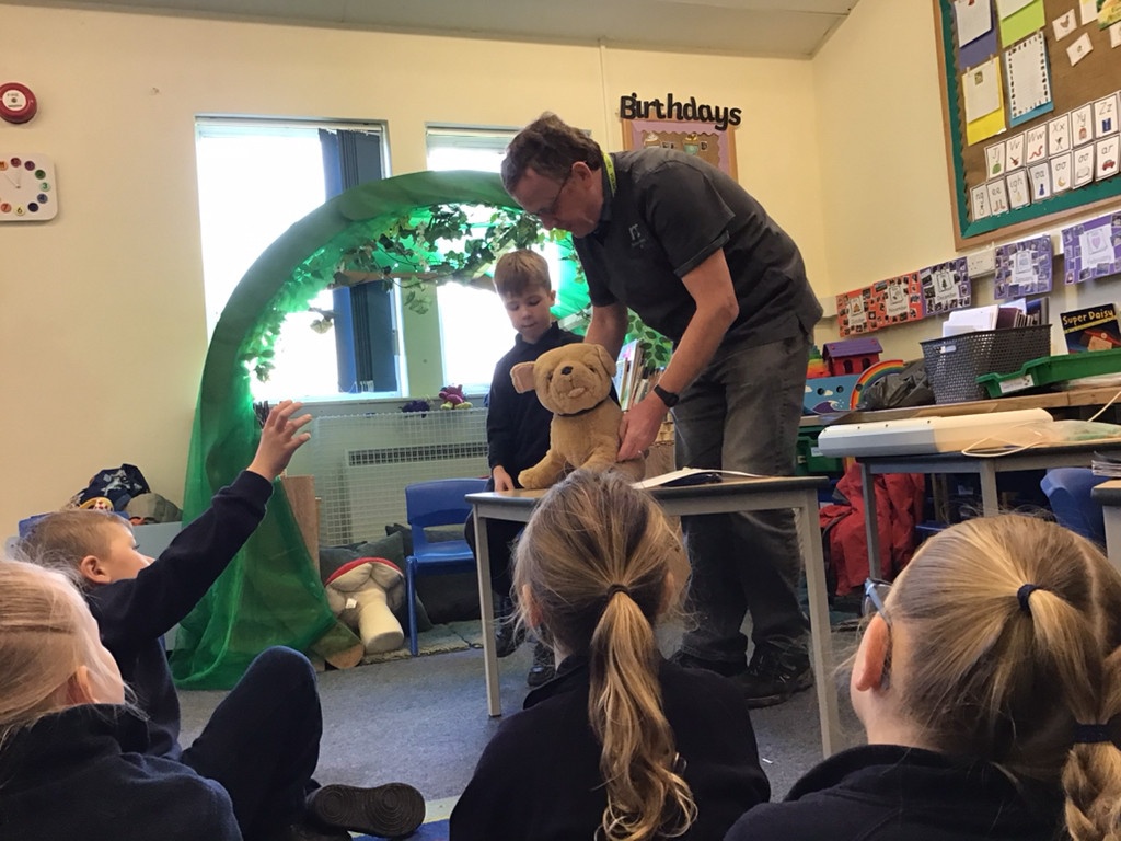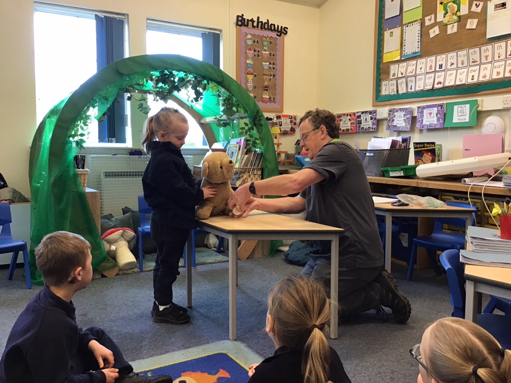 The children helped the vet to look over Spot the dog to see if he was ok. They then got to see the vet use a stethoscope to listen to Spot's heartbeat, before giving him some medicine with a syringe and bandaging his paw.