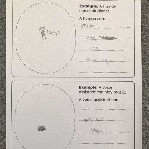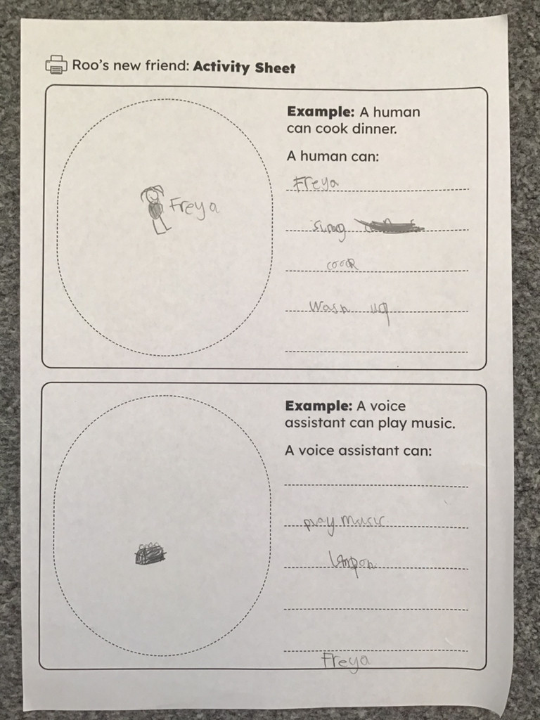 Reading a little story about Roo and voice assistants and then identifying what humans do best and what voice assistants do best.